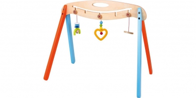 Früh übt sich, der Mal ein grosser Sportler werden will. In diesem Trimmgerät aus Holz „trainieren“ Babys ihre Muskulatur. Haptische Handschmeichler - in denen jeweils eine Glocke, ein Spiegel sowie bunte Holzkugeln befestigt sind – sorgen für erste Erfahrungen in Sachen Hand-Augen-Koordination.