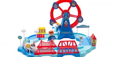 Sobald der Schaffner winkt, rollt der Zug mit tollen Soundeffekten los über die Brücke, an den kleinen Bachsteinhäusern vorbei, bis er endlich beim Riesenrad angekommt.